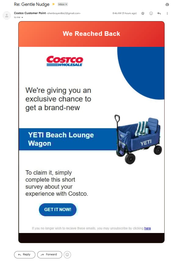 There’s a new Costco scam hitting email boxes recently and people are falling for it. If you get an email with subject “Re: Gentle Nudge” from “Costco Customer Point” just delete it. They are trying to harvest your information. We suspect they may also be trying other subject lines. Here is what the email looks like if you open it…